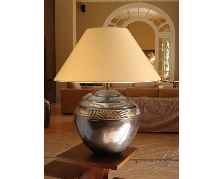 Descripción: Láminado metálico, acabado artesano. Pantalla de algodón crudo.
